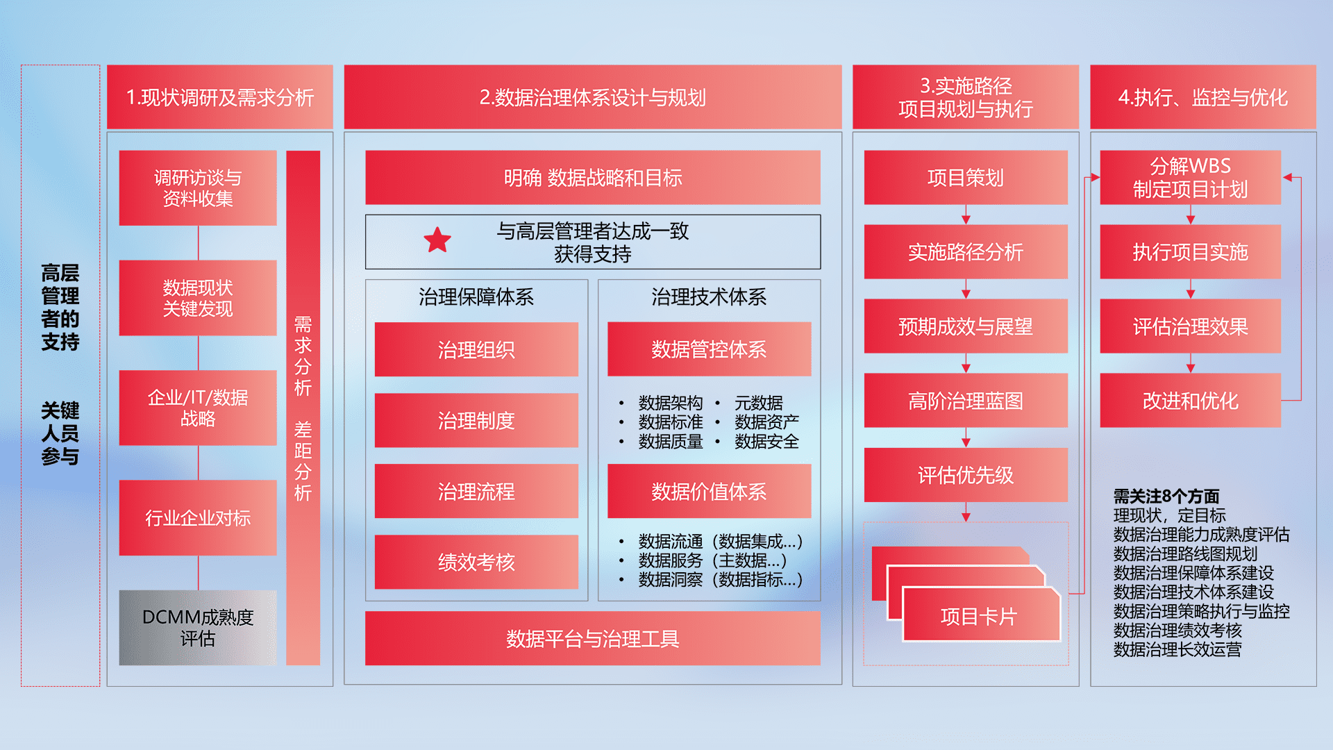 制定并执行统一的数据标准,,,规范数据定义和格式,,,,消除冗余和不一致性,,,,实现跨部门和跨系统的数据一致性,,,为企业提供标准化的数据基础。。。